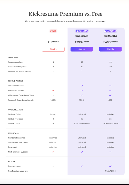 Kickresume offers a free plan and premium tiers based on monthly access.